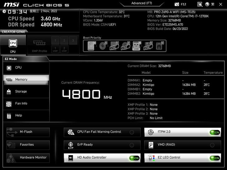 透過主機板的BIOS也可看到,速虎T4 DDR5-4800MHz 16GB*2 並無設計 XMP 可調。