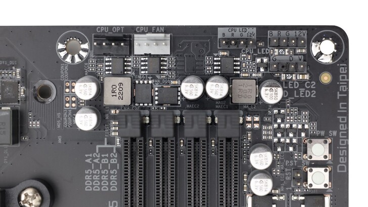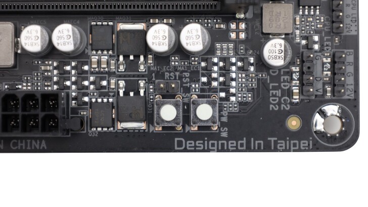 主機板右上角,有兩顆按鍵。在上面(圖中右邊)的是 PW_SW,是電源開關。在下面(圖中左邊)的是 RST_SW,是系統重置按鈕。一旁還有 Designed In Taipei 字樣。