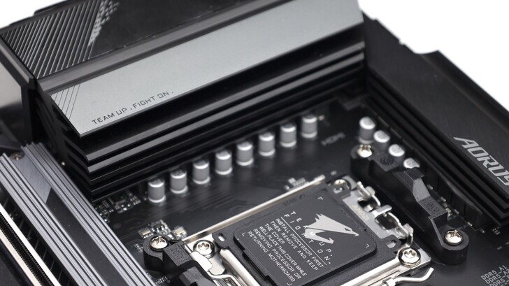 VRM 散熱片表面處理相當好,黑色部分的髮絲紋細緻均勻。特別是銀綠色部分,應該是在髮絲紋處理上再上漆,因此近一步減少了髮絲紋的紋路感,也不容易凸顯手油,未上漆部分的字為 AORUS Slogan「Team Up. Fight On.」。頂部 VRM 的黑色散熱片,表面也有細緻的髮絲紋處理,並有 AORUS 字樣。
