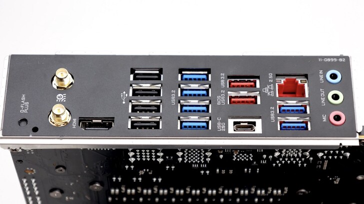 四個 USB-A 支援 USB2.0 480Mbps。六個 USB-A 支援 USB3.2 Gen1 5Gbps。兩個 USB-A 支援 USB3.2 Gen2 10Gbps。一個 USB-C 支援 USB3.2 Gen2 10Gbps。網路阜為 2.5GbE。三個音訊阜。