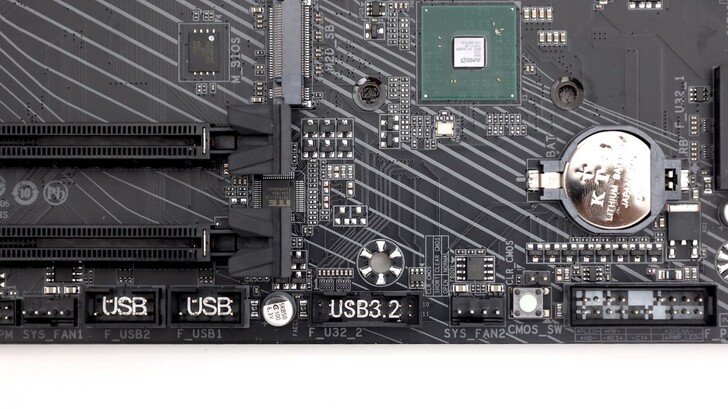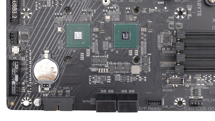 兩顆 Chipset 都設計在記憶體下方,彼此的距離也很近,是目前看到距離算比較近的安排。在同一片金屬散熱片下方,因此 GIGABYTE 這張板子的 PCH 散熱片相較以往也比較大。