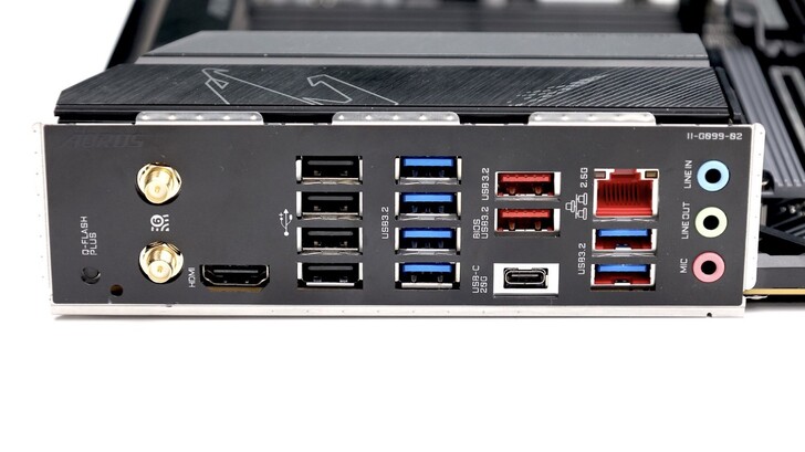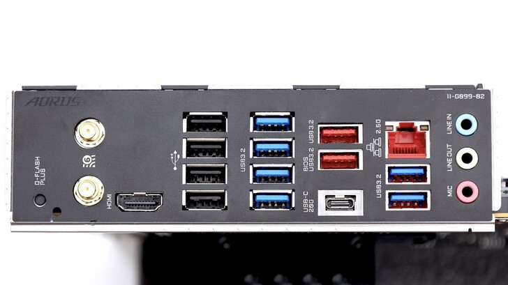 頂部有一個 Q-Flash Plus 按鈕,對應到下方 BIOS USB,可以在無處理器、記憶體的狀態下更新 BIOS。一組無線通訊接頭。