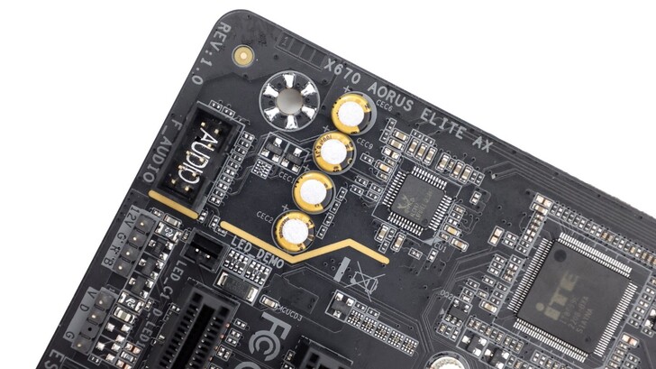 主機板左下角寫著 X670 AORUS ELITE AX REV.1.0,音效晶片為 Realtek 的 ALC897。
