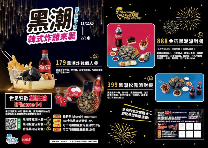 同時推出世足狂歡集點抽獎活動,咚雞咚雞表示:來店消費滿100元即可獲得1點,集滿6點就可參加抽獎,凡購買指定黑潮韓式炸雞餐,點數再加倍!活動獎品豐富,除了可口可樂限量鑰匙圈、可口可樂限量世足盃紀念足球、888金箔黑潮派對餐等,更有機會獲得最新款iPhone 14手機,有吃又有拿,提醒舊雨新知好康報報,以免向隅。