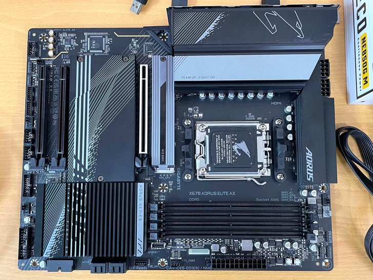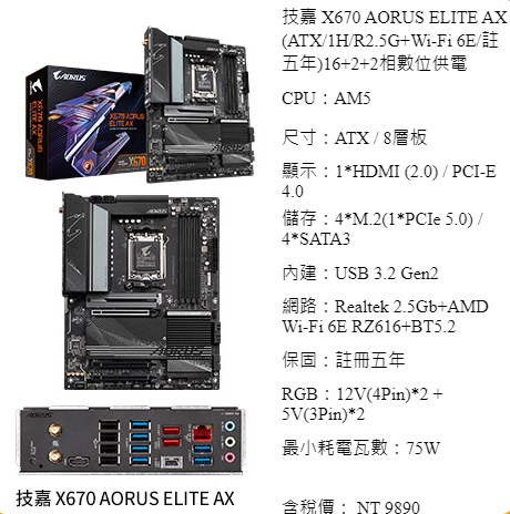 其實原本是打算入手 7600X 搭配最便宜的 X670 GAMING X AX 這片主機板, 理由是在 B650 還沒出來前它是最便宜且具有五年保固的主機板, 而且它的電源相數也跟 X670 AORUS ELITE AX 一樣, 但看了一下通路的簡易介紹中有提到是八層板, 或許對記憶體的支援度或是可玩性會比較好一些, 最後就多花個 2000 換成 X670 AORUS ELITE AX.