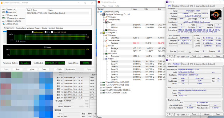 這個是使用 AIO 360, 一樣頂到溫度牆, 處理器時脈都落在 5.1GHz 左右.