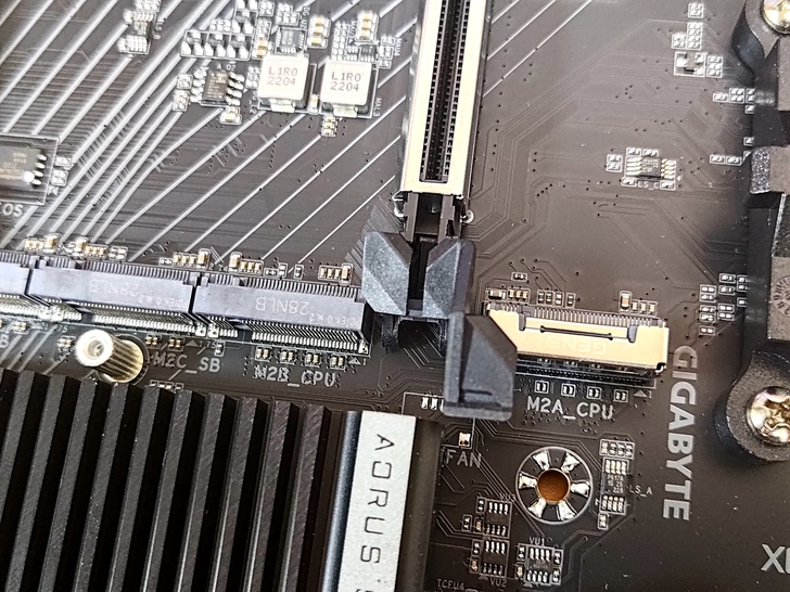 其實技嘉這幾年在一些小細節上的處理確實是越做越好, 以現在顯示卡每張都越來越大張, 在PCI-E槽末端的海豚尾設計也特別變化改良, 直接從顯示卡的右側一按壓就起來了, 再也不用螺絲起子在那邊戳阿戳, 還要擔心戳到主機板被判定人損 (筆者相信很多人都有這種經驗XD)