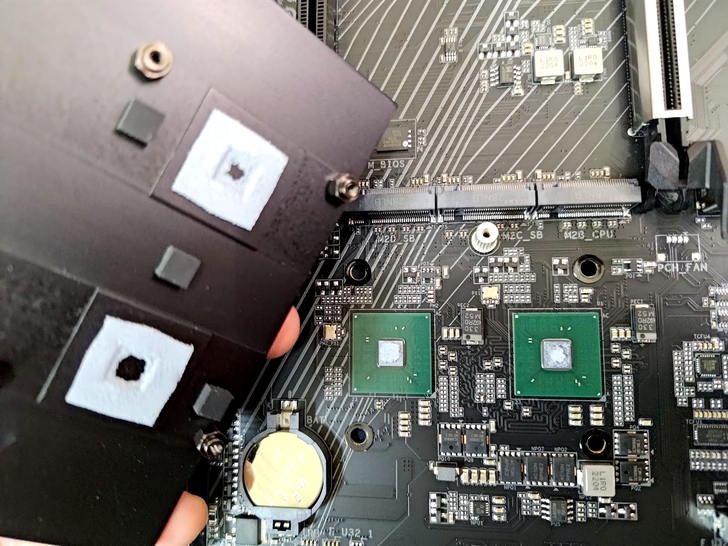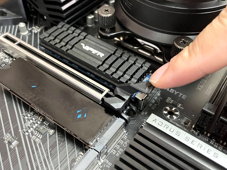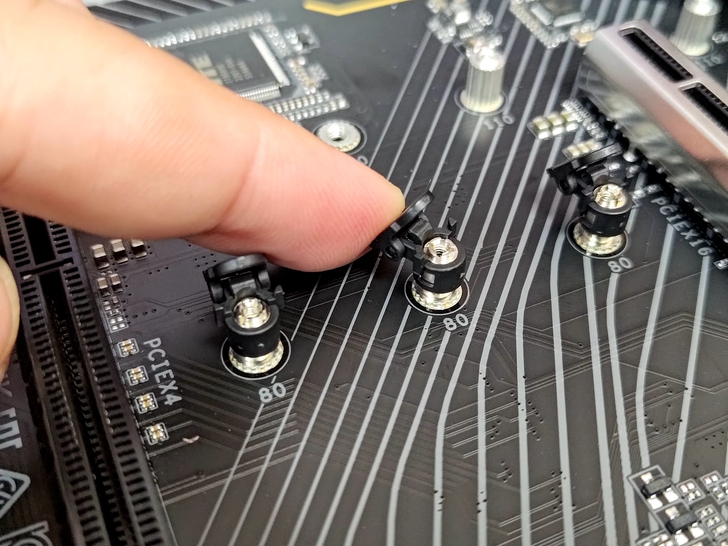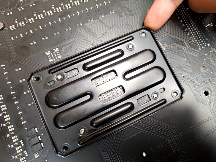 M.2 SSD 固定方式是這種按壓式固定, 這種設計還蠻方便且快速的, 假設今天沒有安裝散熱片飾板, 是真正可以實現免螺絲快速安裝.