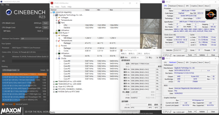 僅開啟EXPO跑 Cinebench R23 測的單核成績與網路上各家媒體的實測差不多, 在多核上的成績有點小掉, 初步推測有可能是直接頂到溫度牆, 啟動了一些保護機制.
