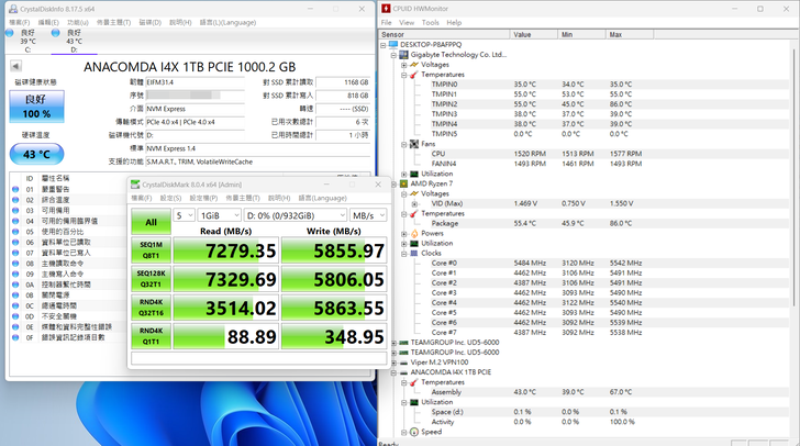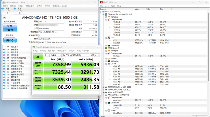 前面有提到 X670 AORUS ELITE AX 上的 M.2 散熱片是否有無功能, 這邊使用巨蟒新的 I4X SSD來進行測試, 原先 I4X 上已經有貼上石磨烯散熱片了, 但實測溫度仍高達80度.