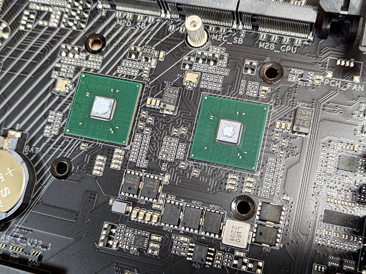 兩顆Chipset 藏在大面積的散熱片下方, CMOS電池也意外的被蓋住, 但也因為這樣子主機板上有多設立一個 CLR_CMOS 的按鈕, 避免重設回覆設定時還要拆散熱片拔電池.