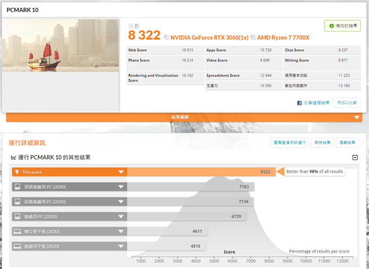 若直接再補上一張 RTX3060 12GB的顯示卡, 在PCMARK10 的評測結果也是前前段班了, 畢竟現在 RTX4090 / RTX 4080 剛推出有點難以入手, 先入手一張 RTX3060 當個等等黨也是不錯的選擇.