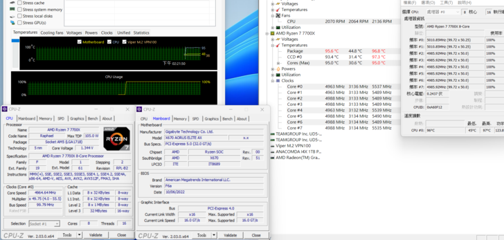 假設你也想要入手 AM5 平台, 又是新手不會調整這些設定時, 那散熱器該如何選擇? 這邊筆者也分別使用 AIO 360 以及 AIO 240測試, 可以了解到不論今天是使用哪一種, 使用AIDA64單烤FPU都會直接頂到 95度的溫度牆, 唯一的差別就是 CPU 時脈降頻的幅度有多少, 也是一樣可以摸摸自己口袋深度來衡量一下, 不然就跟筆者一樣去研究如何調整BIOS來最佳化省錢XD