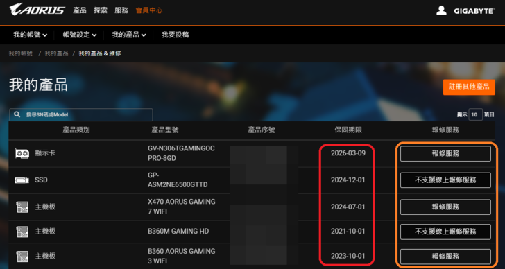 另外再講講保固註冊系統, 若以 AMG 御三家來比較, 技嘉的註冊系統真的方便許多, 而且註冊了就馬上顯示生效, 不會有其他家需要人工審核或是註冊到資料完全不見的狀況.