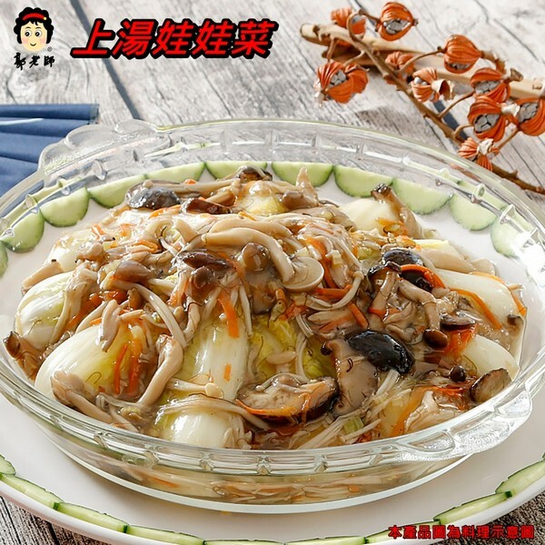 上湯娃娃菜:湯頭以蘋果、紅蘿蔔、甜玉米、白蘿蔔等多種新鮮天然食材熬製的蔬菜高湯為基底,加入髮菜、娃娃菜、台灣履歷香菇、鴻喜菇、金針菇等多種天然食材,口感豐富,娃娃菜吸收高湯鮮甜,吃起來格外有層次。