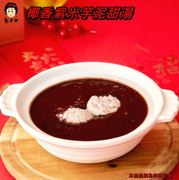 椰香紫米芋泥甜湯:小火慢煮的紅豆紫米甜湯,搭配大甲芋頭製成的綿密芋泥,散發濃郁的椰奶香氣,讓您吃在口裡甜在心裡。