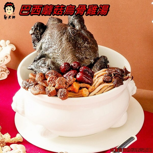 巴西蘑菇烏骨雞湯:使用烏骨雞全雞,精選巴西蘑菇、柳松菇、香菇,高湯以純雞骨加入黃金比例天然食材,熬製至少8小時的時間,熬出甘甜可口的全雞湯,順口不膩 。