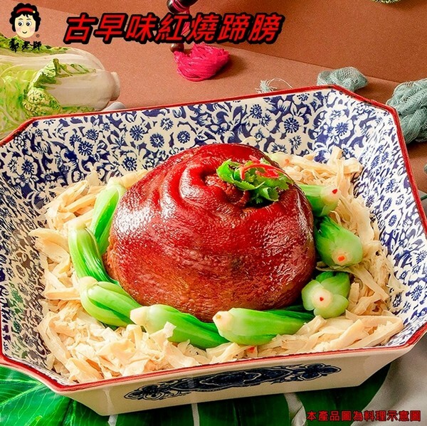 古早味紅燒蹄膀:嚴選台灣優良CAS認證豬蹄膀,肥瘦比例佳,富有膠質,蹄膀經過川燙、油炸 ,加入冰糖、豬大骨高湯以古法滷製,呈現出光亮Q彈的口感。