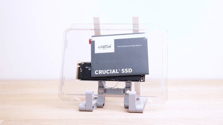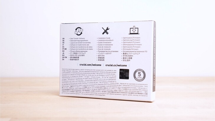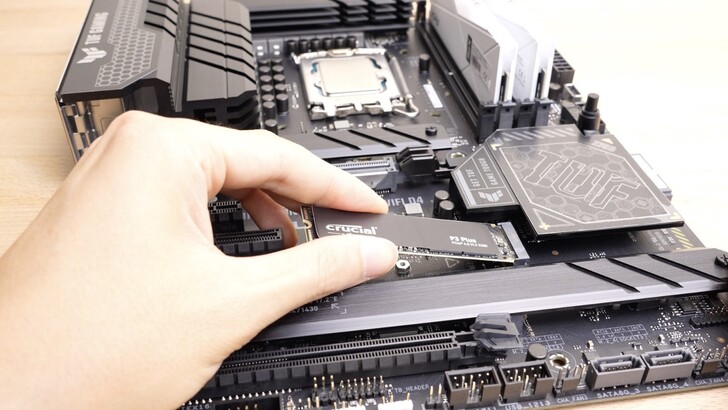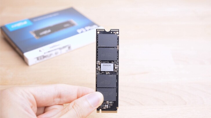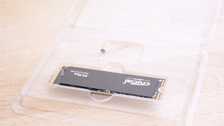 Crucial P3 Plus 因為不是速度頂級的 SSD,沒有太大的散熱需求,所以他並沒有隨附金屬散熱片,上面只是一張貼紙而已。不過因為現在主機板為了外觀一致性,幾乎都有搭配 SSD 的散熱片,因此通常隨附的散熱片也大多只有被撕掉的命運而已。