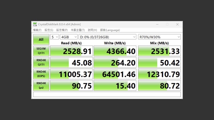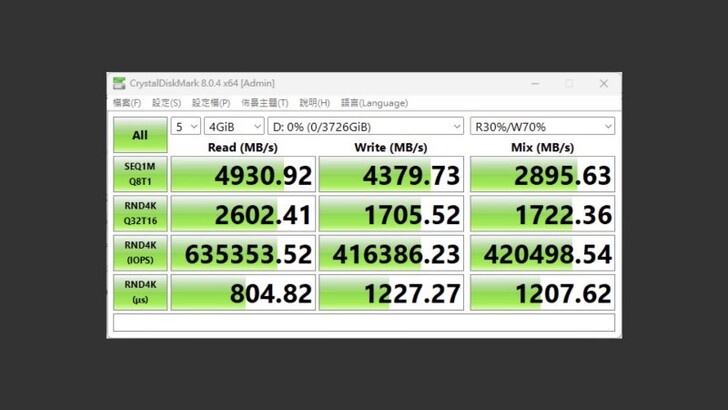 實際使用 CrystalDiskMark 測試讀取 4,930MB/s,寫入 4,379MB/s,都是有達到原廠標榜的 4,800/4,100 MB/s,甚至還小小超過。