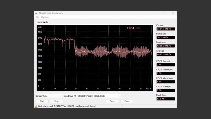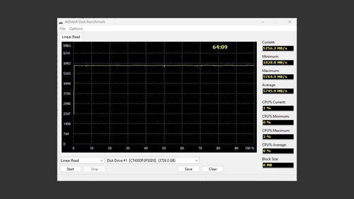使用 AIDA64 測試 Linear Read,全程的表現如止水一般的穩定,表現非常的好。不過眼尖的網友可能也注意到他速度也是飆到 5,700MB/s,雖然說超出官方標示不少,但也在 PCIe 4.0 合理範圍內。