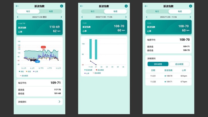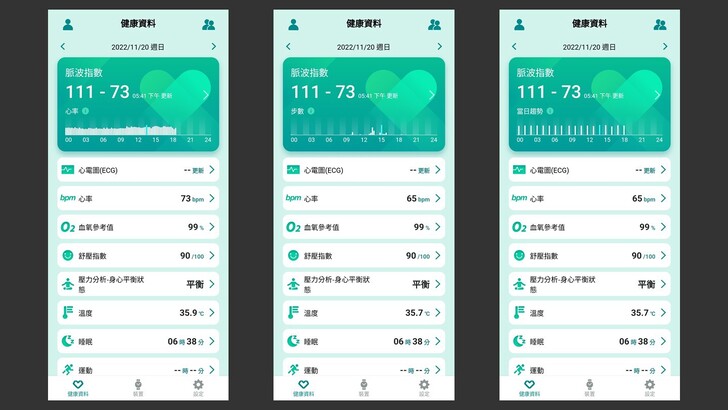 脈波指數類似於我們所熟知的血壓,只是較不一樣的部分是這裡透過兩種感測器加上華碩的演算法,算出收縮壓與舒張壓。Venus 家裡的血壓計有水銀式血壓計跟電子式血壓計,這兩種的血壓量測原理又跟手錶的不太一樣。但相較於手錶,都同樣有不便攜帶的問題。量測出來的數值,如果過高或過低,前方的小圓點就會呈現橘色,提醒你可能要注意一下,看看是否用更精確的儀器測量或是就醫。