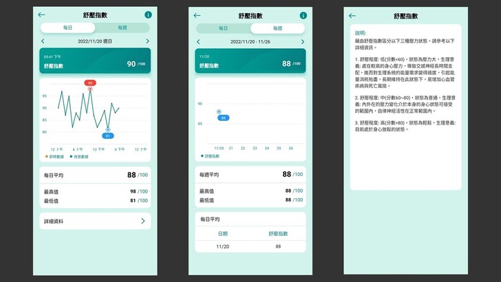 或許你會疑惑,壓力分析跟舒壓指數不是一樣的嗎?分開的意義是什麼?以及為什麼會有顯示壓力狀態,但舒壓指數的分數卻很高呢?其實答案就在測量的項目不一樣的關係。舒壓指數主要是測量心率變異分析(Heart Rate Variability, HRV),也就是說手錶透過測量心跳速率變化來判斷身體是處於放鬆、平衡還是壓力狀態。而壓力分析則是測量交感與副交感神經的結果做判讀。