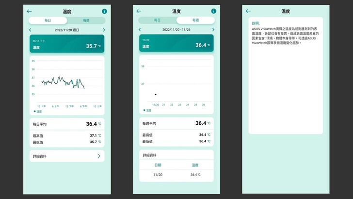 華碩在 VivoWatch 5 上也裝了溫度感測器,但是因為測量的位置是手腕表面溫度,這部分因為已經趨近末梢,加上容易受到外在的溫度影響,故而無法完全當作體溫。而且這支手錶的測量範圍就我觀察大概是 35.0 ℃ 到 37.5 ℃,超過手錶就會顯示白色或紅色的超出範圍。