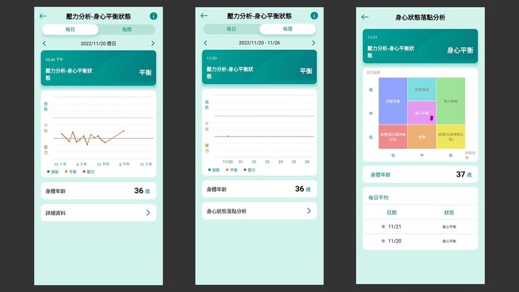 這部分的測量我覺得最有意思的就是身體年齡了!幾個月使用下來,我的身體年齡幾乎都比我的實際年齡高出 10 歲以上,哭啊~我是不是該好好給自己放個假了?另外,華碩還有一個身心狀態落點分析的圖表,可以更容易的理解你的身體是否能適應現階段的生活。我身邊有人測出來的就落在橘色或黃色區塊,加上有時確實身體會不舒服,去醫院就醫後就有檢查出早發性心室收縮,一個因交感神經受刺激而可能會引發的疾病。