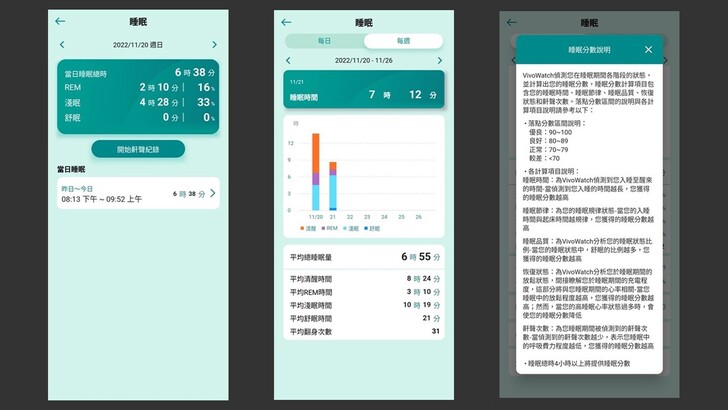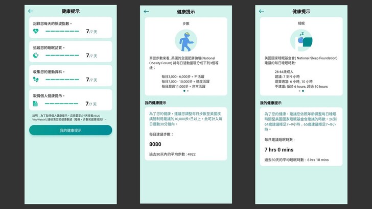 人的一生大概有三分之一的時間都在睡覺,睡眠對於人體的重要性不言而喻。我們不容易知道睡著時身體到底都在做什麼,睡眠監測功能就像是守夜的護衛一樣,隨時監測著身體的數據變化。尤其我觀察到 ASUS VivoWatch 5 的背景量測在察覺人體睡著後,會更加的頻繁測量,幾乎是每分鐘的變化,它都知道。