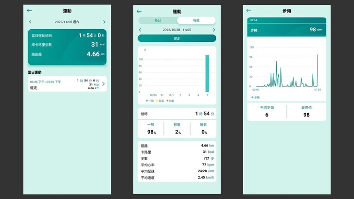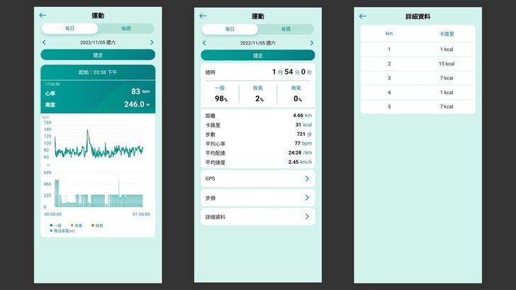 運動中所紀錄的數據,會因為不同種類的關係而有所不同。就像同為跑步,戶外會比室內多了一個 GPS 的資料,可以在 App 中看到跑步的路線圖。以及一些共同會有的數值,像是速度、卡路里、時長,以及有氧運動跟無氧運動的比例。