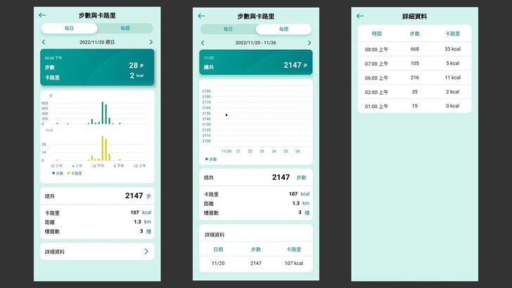 首先要看到的就是常見的紀錄一天的走路步數的功能。紀錄的部分也非常簡單,就是步數及消耗的卡路里數。可以自行設定每天的目標步數和卡路里數,當完成時,手錶就會震動提示,並且出現一個獎盃圖示,恭喜你完成一天的目標。
