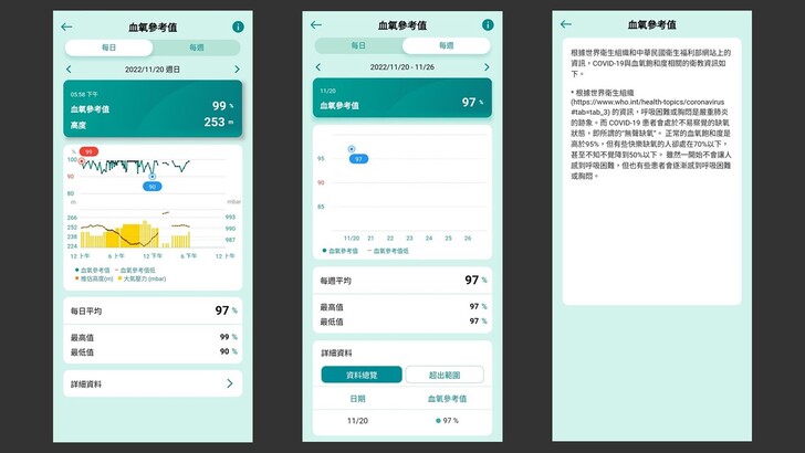 新冠疫情爆發以來,越來越多人認識到「快樂缺氧」這個隱形殺手。許多人開始購買血氧機,但坊間常見的血氧機大部分是測量手指末梢來得到血氧濃度。然而這樣的測量方式有時會帶來一些不便,像是打鍵盤時你無法一邊打字一邊讓手指夾著血氧機。市售的穿戴式裝置許多都有搭載監測血氧的功能,VivoWatch 5 這支注重健康的手錶當然更必須有此功能。清醒時會保證每小時至少有一次數據,而睡眠時則是大約五分鐘就有一次。