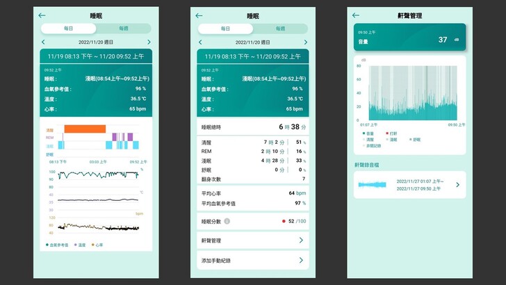 睡眠時間四小時以上時,系統會算出一個睡眠分數,並且這裡有一個很特別的功能叫鼾聲管理,使用者可以透過增加睡眠時的錄音,來得到更準確的分數。分數表示這次的睡眠品質,若品質不佳者,可以看一下說明的部分,了解一下可能原因。不過因為系統上只是列舉了可能的因素,並沒有直接點出問題出在哪,所以我自己是看了半天還不太清楚啦。想改善,但也有點不知從何下手,畢竟好的睡眠比時長更重要啊!