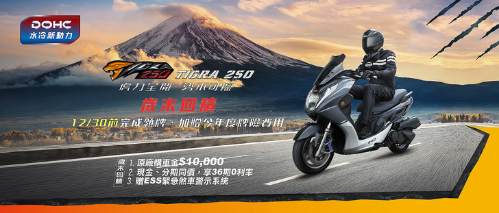 摩特動力 PGO 由衷地感謝 TIGRA 250 車主的力挺與等待,讓黃牌小鋼炮在 300c.c. 級距銷售持冠,原承諾於111年12月底前完成領牌交車的車主,將全數加贈 ESS 緊急煞車警示系統的同時,PGO 決定最終倒數再加碼,讓車主免負擔牌險費用,還能參與 PGO 樂透彩十萬現金大方送活動!