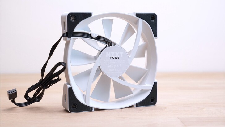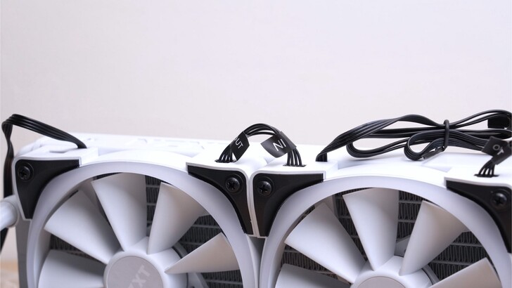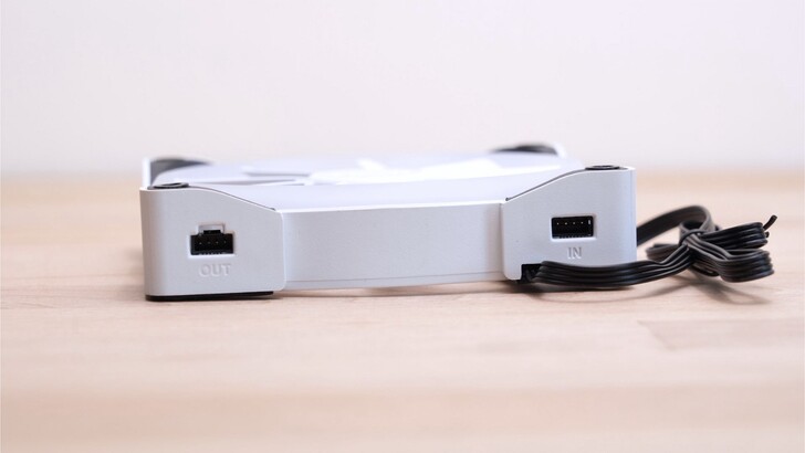 風扇上方有 IN 和 OUT 的插座,可以使用內附的短線將三個風扇串接。有些風扇是電源和 RGB 各自一條線,組裝起來線就一大把,整線時就會比較麻煩。而 NZXT KRAKEN Z73 RGB 的風扇這種設計相對起來我是比較喜歡的。