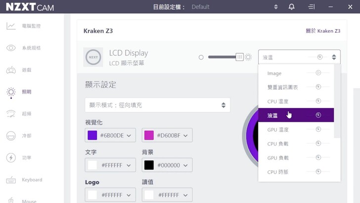 水冷頭預設就有相當多種顯示資訊可以做選擇,顯示模式和顏色也有很大的自定義空間,色調、文字、背景、Logo 通通可以設定。不過由於我個人自認沒什麼配色的美感,就用 NZXT 預設的,感覺還是很帥。