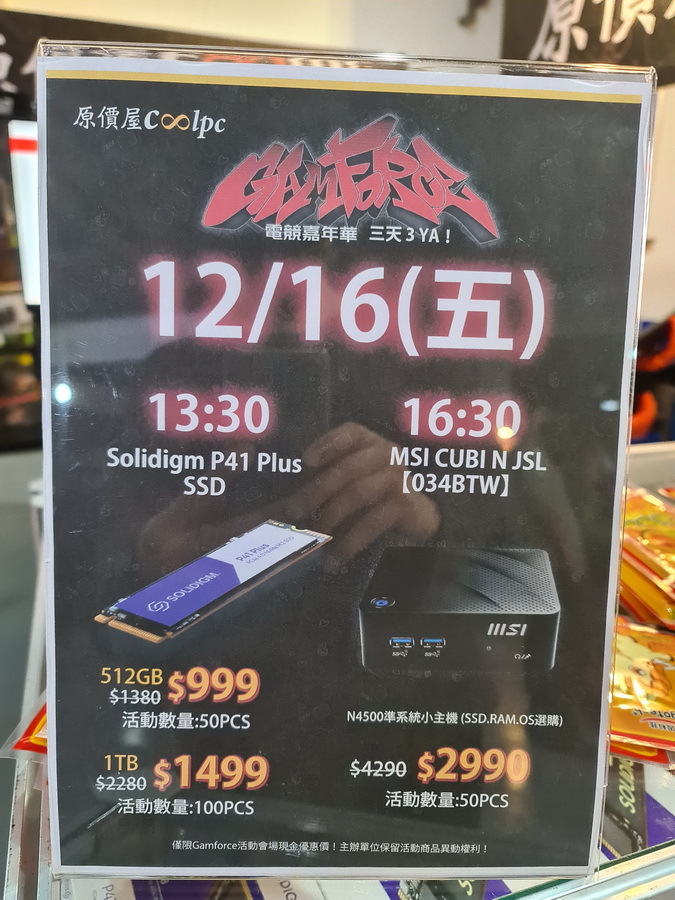 【原價屋 特賣活動】 ▼ 每年都一定要參加的 GAMFORCE電競嘉年華,今年當然也是不錯過,買了門票也同時購入了滑鼠墊及T恤。 ▼ 此次最棒的就是 原價屋 每天都有產品特賣活動,第一天看到 Solidigm P41 Plus SSD 便宜那麼多的情況下。 ▼ 立馬聯絡朋友一起入手了幾條,直接拿來當系統碟也爽。 ▼ 特賣真的超便宜,買了真的不會後悔。 ▼ 看看最後一天的搶購人潮,就知道有多可怕了。 【攤位巡禮】 ▼ 每家廠商都是在有限的空間下,全力的展現最新的產品。 ▼ 幾乎所有的廠商都有自己的小遊戲,甚至當下就可以參加抽獎。 ▼ 當然美美的SG也是不可少的,讓玩家更有動力玩遊戲。 ▼ 廠商的體驗區也都打造得很有特色 ▼ 也有廠商推出自己的特賣活動,真的是超便宜的。 ▼ 聯力的攤位也是讓玩家超注目,除了展示出最新款的機殼,牆上的一整排積木風扇,真是太閃亮了。 ▼ 其它攤位都可以看到玩家一邊玩一邊搶贈品,現場連最新螢幕都特賣,真的是不能錯過。 讚 收藏 快速回應 引言回應