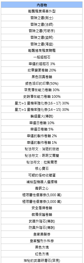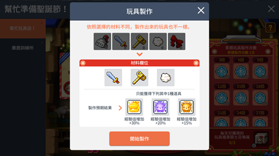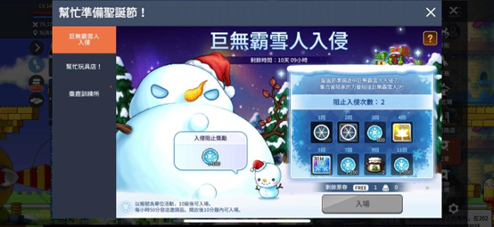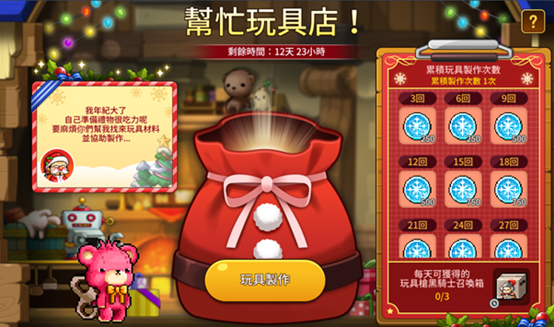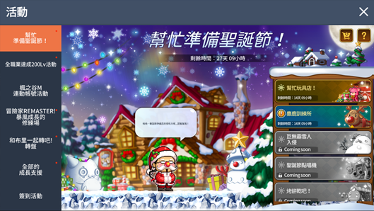 這個月最大的節日就是聖誕節,楓之谷這個月除了推出最新改版的冒險家之外,還是有出了一系列的「幫忙準備聖誕節」活動,還是跟之前一樣非常用心,但是不得不說少了硬幣的門檻,感覺上有一點小小閹割了,雖然我自己很不愛硬幣門檻(像之前的萬聖節,有硬幣門檻,能換得東西也比較多一點),但這次沒有門檻能換得東西雖然少一點,但還是滿有用的,而且再加上這次全新改版冒險家,讓我重練又加上聖誕活動,升起等來也滿快的(買了一堆經驗券、自動戰鬥),先附上聖誕節活動:幫忙準備聖誕節!時間表。