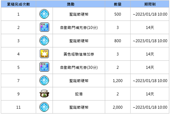 活動期間:2022/12/15(四)更新後~2023/01/18(三)09:59(各伺服器時間)