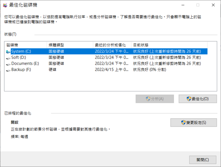 Windows 10中有一個內置實用程式來優化磁碟機。它同時支持優化/最佳化HDD和SSD。默認情況下,該工具每周自動最佳化磁碟機一次。但是如果您想檢查磁碟機狀態並手動優化它們,您也可以使用它。