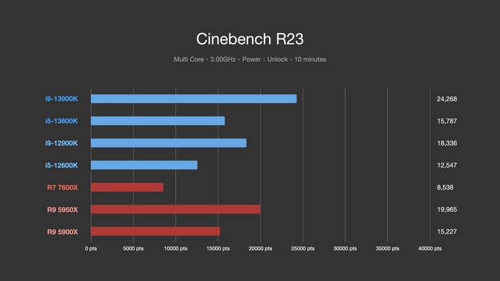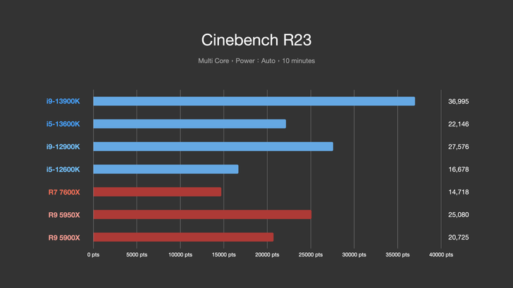 第一站 Cinebench R23。多核心,功耗限制:自動,運行 10 分鐘。i9–13900K 比 i9–12900K 提高 34.16%。i9–13900K 比 i5–13600K 高 67.05%。i5–13600K 對比 i5–12600K 提高了 32.79%,介於 R9 5900X 和 R9 5950X 之間。i9–12900K 比 i5–12600K 高 65.34%。