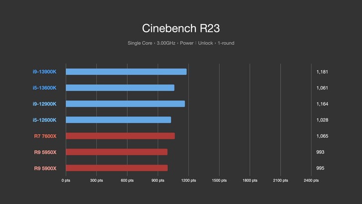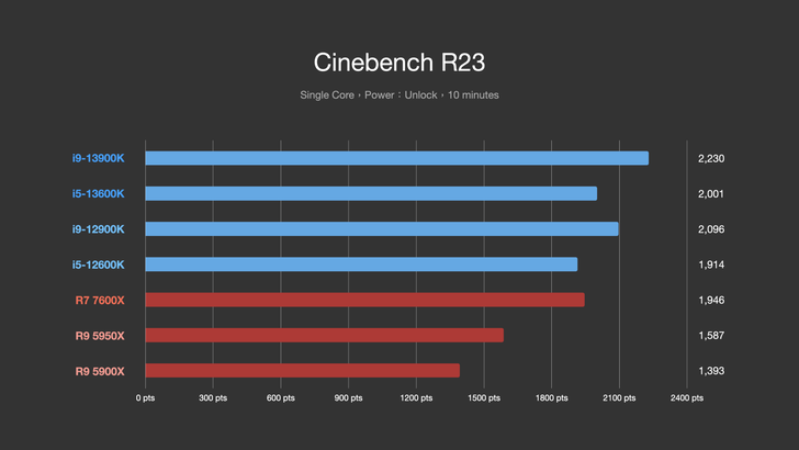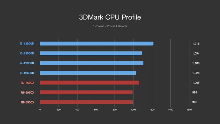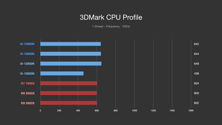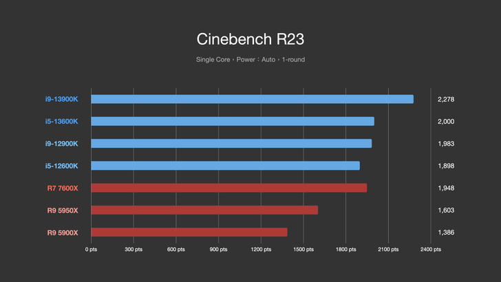 單執行緒狀態下,i5–13600K 和 i9–12900K 依舊是差不多,與 Cinebench 狀態相似。i9–13900K 則拉開與大家的距離領先一些。R5 7600X 則介於同級的 i5–13600K 和 i5–12600K 之間。