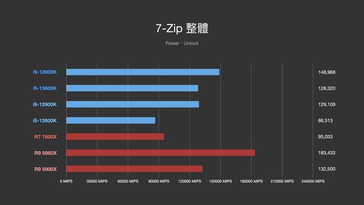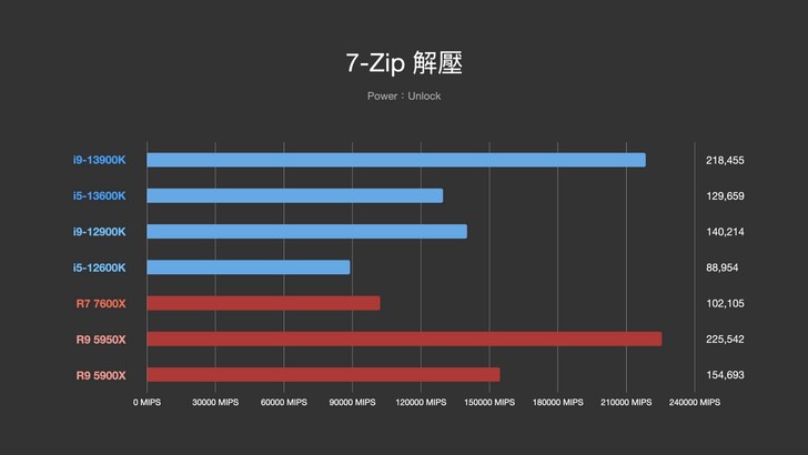 在 7-Zip 解壓縮項目中,看來 i9–13900K 終於發揮應有水準。不過 R9 5950X 依舊是高過 i9–13900K 一點,如果有 R9 7950X 可以測試,大概又會再多出一大截。