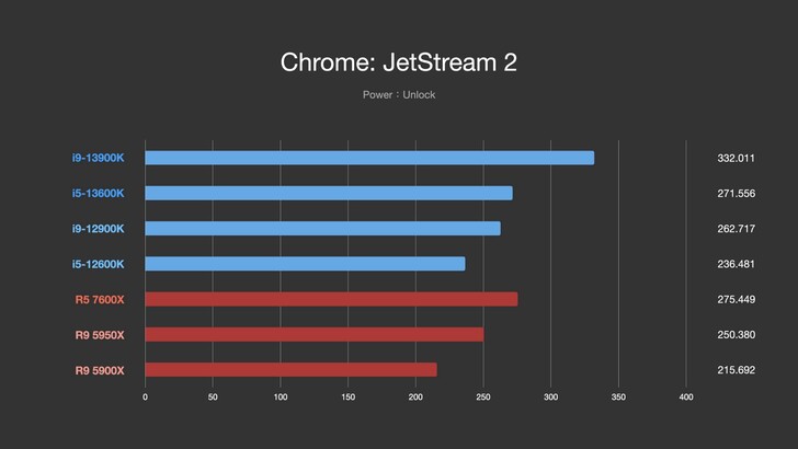 在功耗解鎖下,以 Chrome 瀏覽器測試 JetStream 2。i5-13600K 小超上代 i9–12900K。R5 7600X 也與上代旗艦 R9 5950X 拉出一段距離。