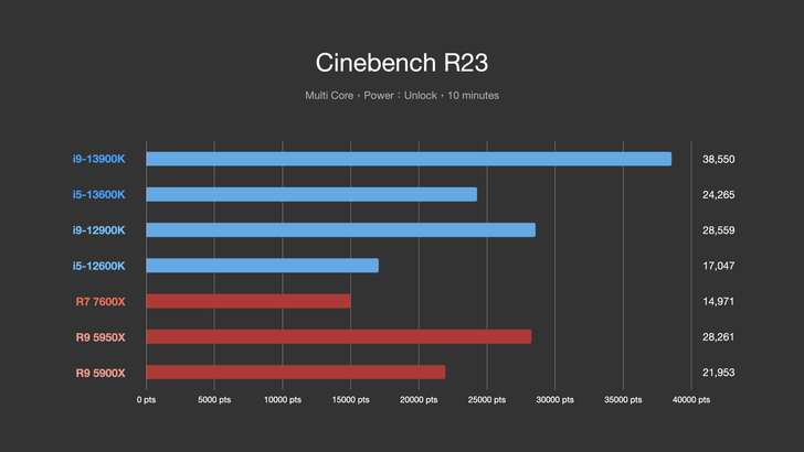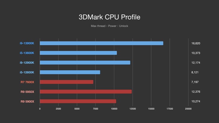 AMD 陣營因為我們手上沒有 R9 7950X、R9 7900X 這兩顆 CPU,只有用過 R5 7600X,因此畫面和分數上會少一些 R9 Zen4 的衝擊,不過 R9 5950X 和 R9 5900X 是已有的處理器,所以總共有三顆橫跨兩代的型號。數據測試來源皆為 EnterBox 測試。