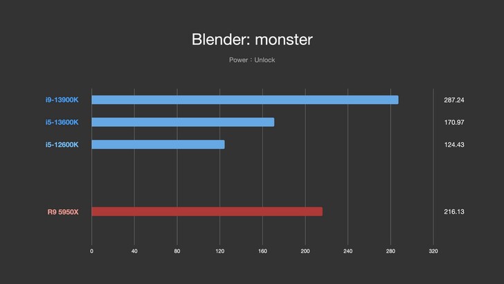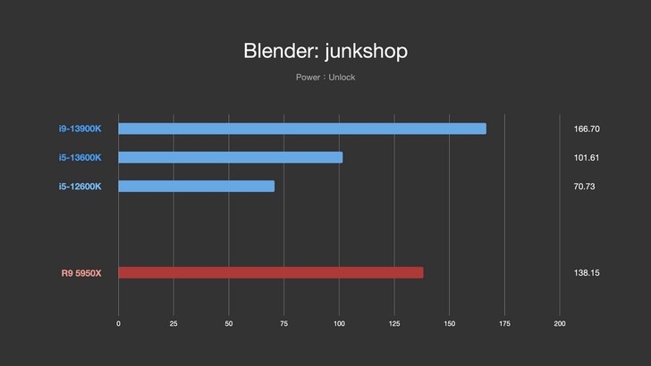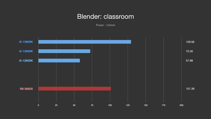 這邊沒有放 i9–12900K 以及 R9 5900X 的測試數據,主要是之前測 Blender 的版本、項目不同,無法沿用比較。而 R5 7600X 當時時間有限,缺席此項目測試。因此只有放出 i9–13900K、i5–13600K、i5–12600K 以及 R9 5950X 的數據。
