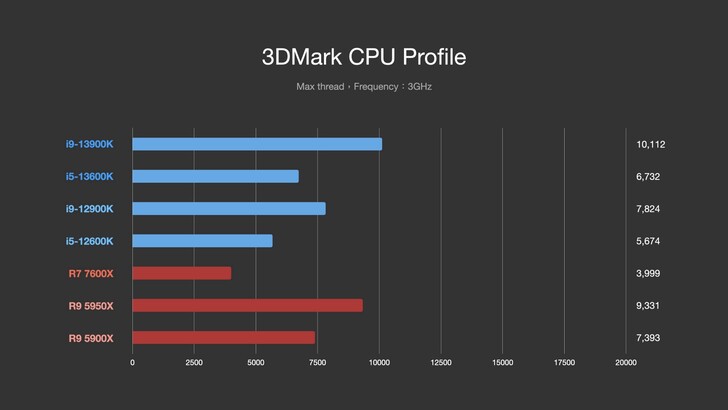 3DMark CPU Profile 所有執行緒,時脈固定 3.00 GHz。前面功耗解鎖的多執行緒情況下,R5 7600X 還沒有脫隊太多。到這邊固定 3.00 GHz,與倒數第二名的 i5–12600K 都有不小差距。R9 5950X 則介於 i9–13900K 和 i9–12900K 之間。