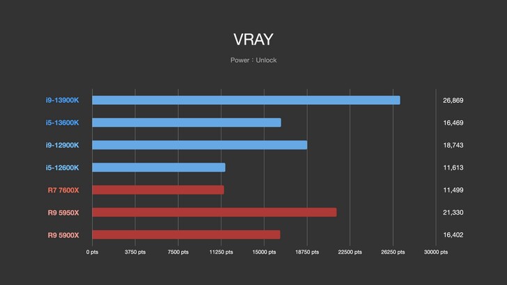 在我們已有的處理器來說,i9–13900K 在 V-RAY 拔得頭籌。不過比較一下其他人測試的結果,若將 R9 7950X 加入,則會壓過 i9–13900K。