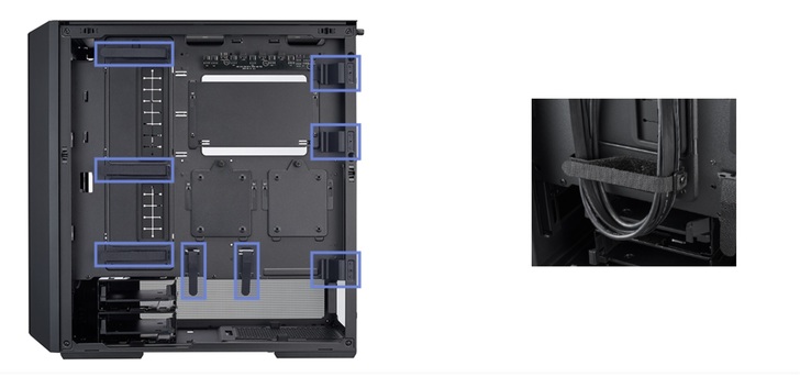 ▼在機殼內部的電纜管理上提供廣泛的線纜管理解決方案 : 貼心配置3個大魔術貼帶 、 3個小夾子 、 2個尼龍搭扣帶來方便固定電纜,能讓玩家在機殼整線的過程更加簡潔俐落。